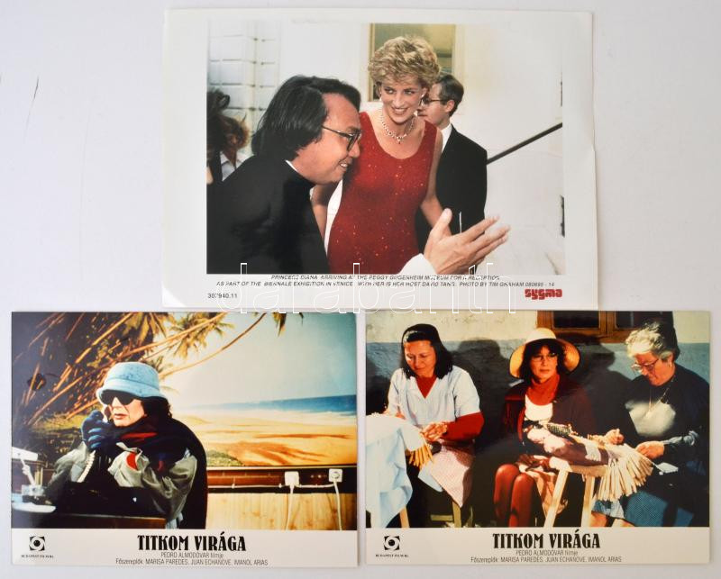 Leírás: Diana hercegnő a Peggy Gugenheim Múzeumban, sajtófotó, az alján feliratozva, 21×30 cm + 2 db filmfotó (Almodóvar: Titkom virága), 18×24 cm