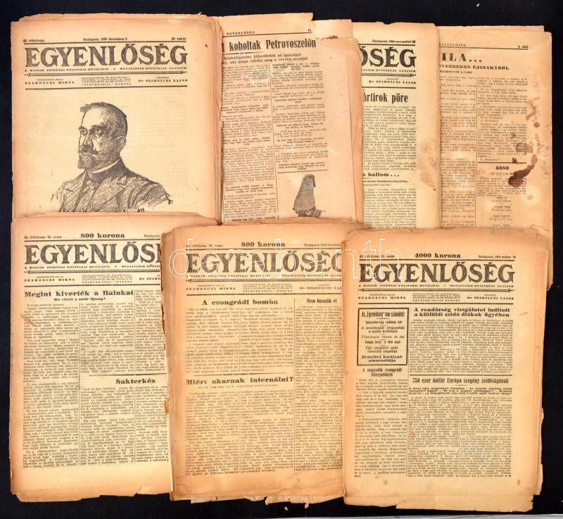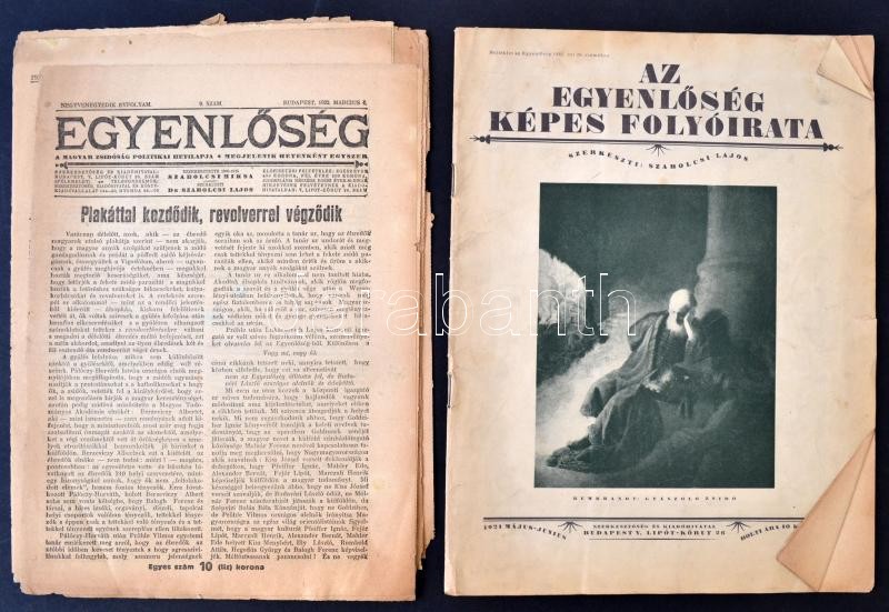 Leírás: 1922-28 Egyenlőség, A Magyar Zsidóság politikai hetilapja, 13 szórványszáma, különböző minőségben, 32x24cm