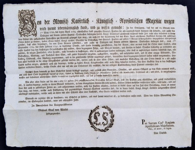 1789 Michael Wallis gróf által kiadott katonai amnesztia / General-pa... https://www.darabanth.com/hu/270-Gyorsarveres/270.0/Festmeny-mutargy-papirregiseg-egyeb/Militaria~2/1789-Michael-Wallis-grof-altal-kiadott-katonai-amnesztia--General-pardon-for-soldiers-48x38-cm~II1362032