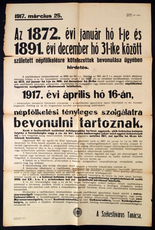 Leírás: 1917 Plakát a népfölkelésre kötelezettek bevonulása ügyében, hajtás mentén kis szakadásokkal, 94x61cm