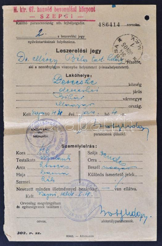 1944 Vitéz Mérey Béla tartalékos hadnagy leszerelési jegye, 19x12cm https://www.darabanth.com/hu/270-Gyorsarveres/270.0/Festmeny-mutargy-papirregiseg-egyeb/Militaria~2/1944-Vitez-Merey-Bela-tartalekos-hadnagy-leszerelesi-jegye-19x12cm~II1366002