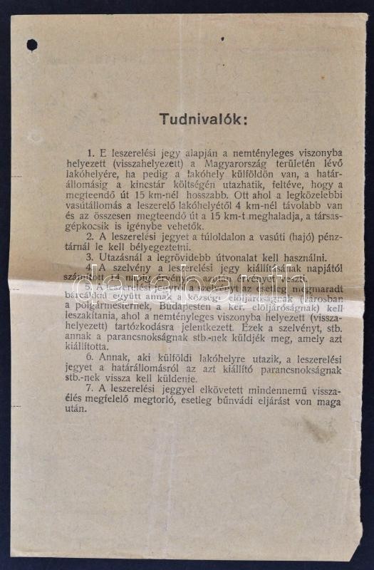 Leírás: 1944 Vitéz Mérey Béla tartalékos hadnagy leszerelési jegye, 19x12cm