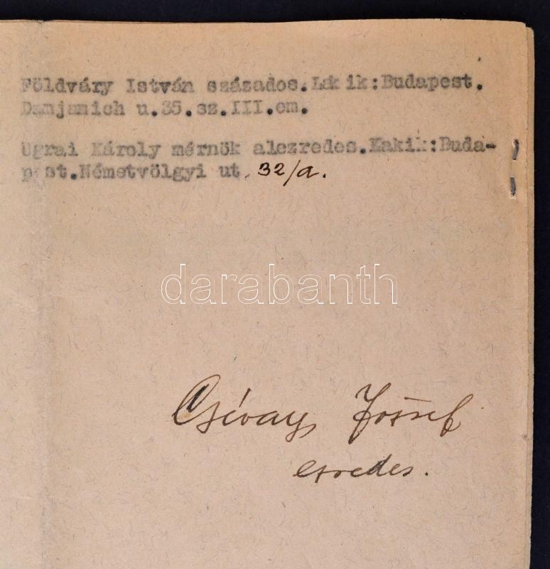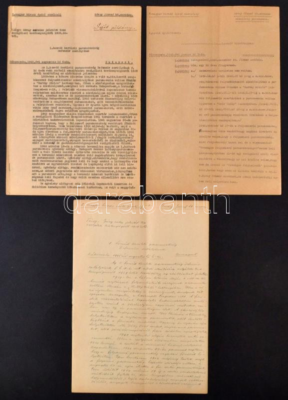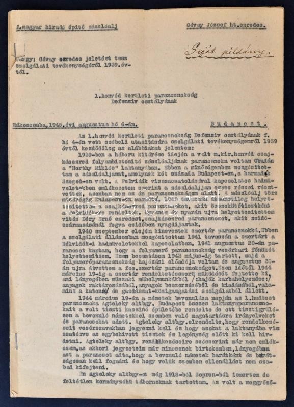1945 Gévay József (1890-?) ezredes, a 2. magyar híradóépítő zászlóalj parancsnokának jelentése jelentése az igazoló bizottság részére 1939-1945 közötti katonai tevékenységéről, kézirat, valamint az arról készül gépelt (saját) példány, illetve annak kivonatolt gépelt változata