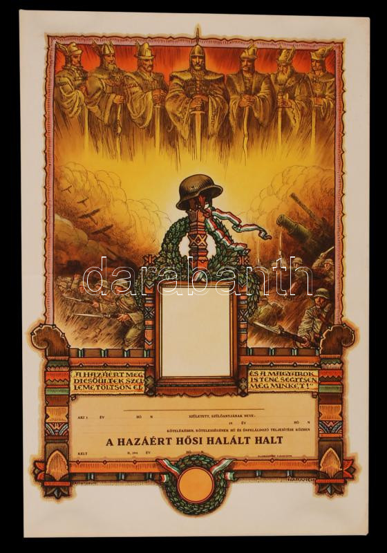 "A hazáért hősi halált halt" feliratú oklevél a 1940-es évek... https://www.darabanth.com/hu/270-Gyorsarveres/270.0/Festmeny-mutargy-papirregiseg-egyeb/Militaria~2/A-hazaert-hosi-halalt-halt-feliratu-oklevel-a-1940-es-evekbol-Kitoltetlen-Athenaeum-Ha~II1366701