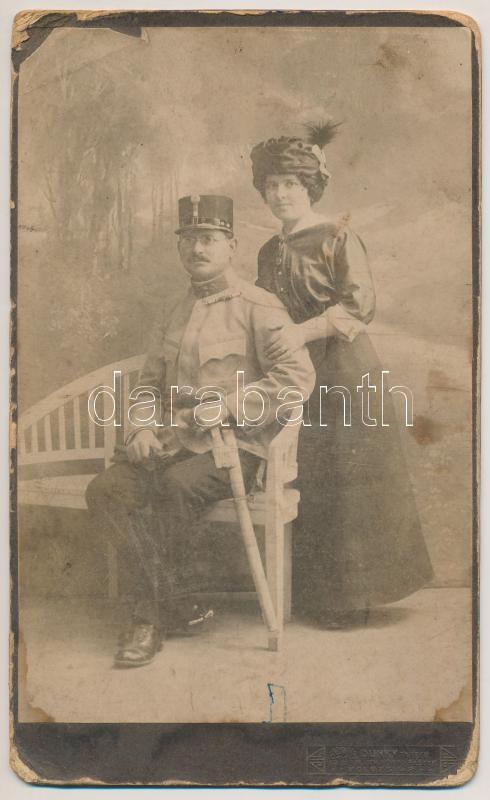 Leírás: cca 1900 Kolozsvár, Katona és felesége, műtermi fotó, sérült, 21x13 cm