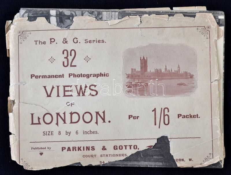 Leírás: 32 Permanent Photographic Views of London. The P. & G. series. Parkins & Gotto. 32 fekete-fehér fénykép Londonról. A papírtok szétszakadt.