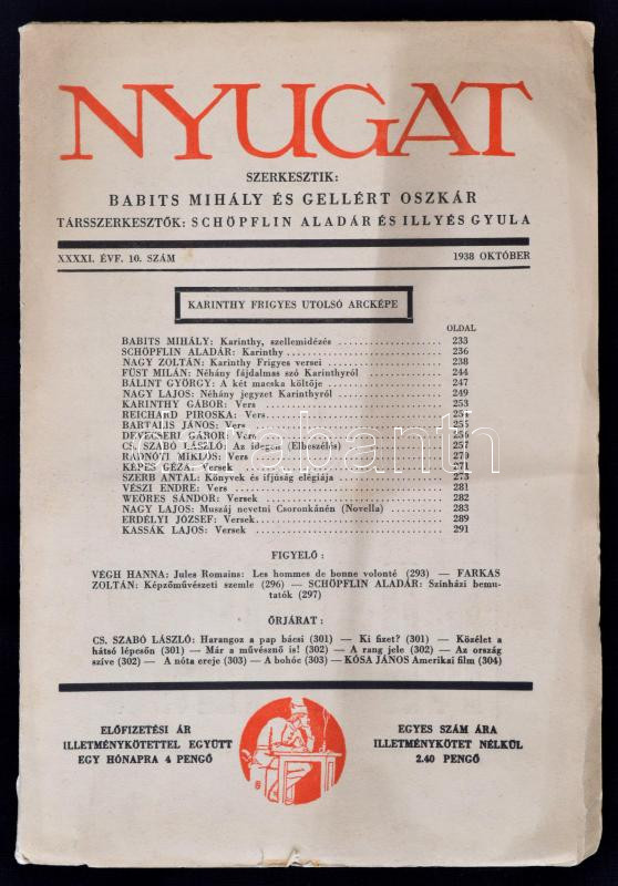 Babits Mihály-Gellért Mihály (szerk.): Nyugat 1936 október. XXXI. évf. 10 sz. Budapest, 1938, Nyugat Kiadó és Irodalmi Részvénytársaság. Kiadói papírkötés, 233-304 p. Karinthy Frigyes emlékszám.