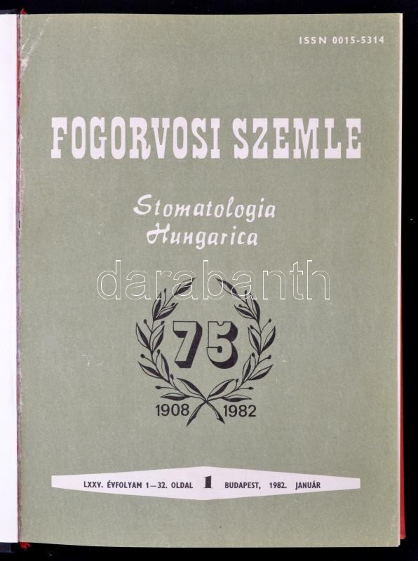 Leírás: Fábián Tibor(szerk.): Fogorvosi szemle - Stomatologia Hungarica. LXXV. évfolyam. 1982.1-12. január-december. Budapest, 1982, Ifjúsági Lapkiadói Vállalat. Könyvkötői fél műbőr, 384 p. Teljes évfolyam! Jubileumi 75. évfolyam.