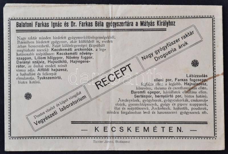 Leírás: cca 1930 Balatoni Farkas Ignác és dr. Farkas Béla gyógyszertára a Mátyás Királyhoz,Kecskemét, recepboríték, 8x12cm
