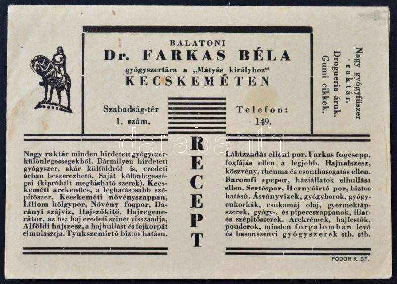 cca 1930 Balatoni dr. Farkas Béla gyógyszertára a "Mátyás Király... https://www.darabanth.com/hu/270-Gyorsarveres/270.0/Festmeny-mutargy-papirregiseg-egyeb/Nyomtatvanyok~4/cca-1930-Balatoni-dr-Farkas-Bela-gyogyszertara-a-Matyas-Kiralyhoz-Kecskemeten-recepbori~II1365456