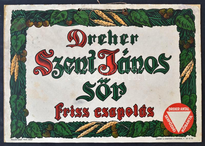 cca 1930 Dreher Szent János sör, litho plakát kartonra kasírozva, Mag... https://www.darabanth.com/hu/270-Gyorsarveres/270.0/Festmeny-mutargy-papirregiseg-egyeb/Nyomtatvanyok~4/cca-1930-Dreher-Szent-Janos-sor-litho-plakat-kartonra-kasirozva--Magyar-es-Kampfner-Litografi~II1350158