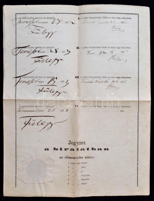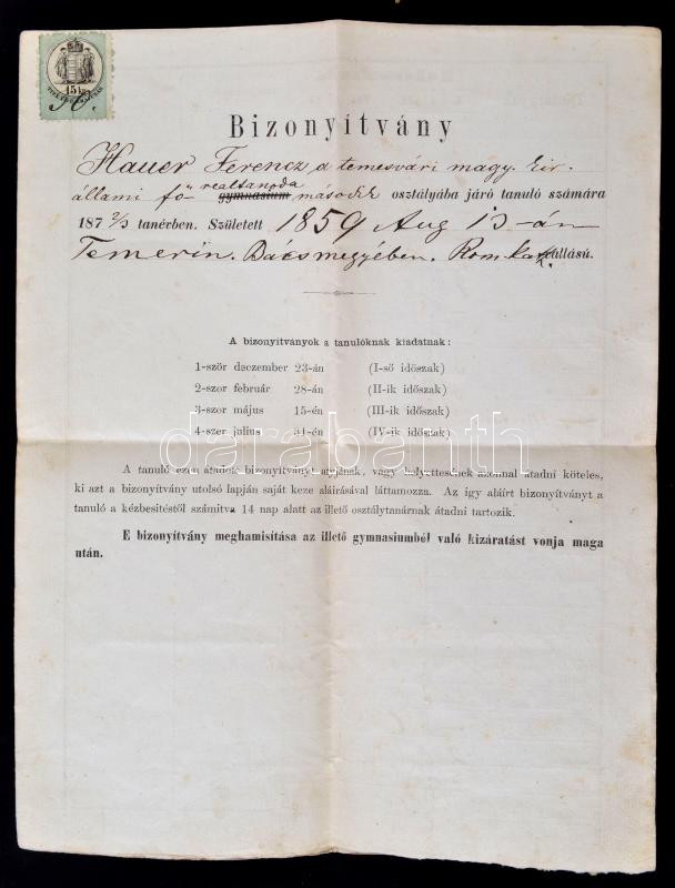 Leírás: 1872 A temesvári magyar királyi állami főreáltanoda által kiállított bizonyítvány 15 kr okmánybélyeggel, szárazpecséttel