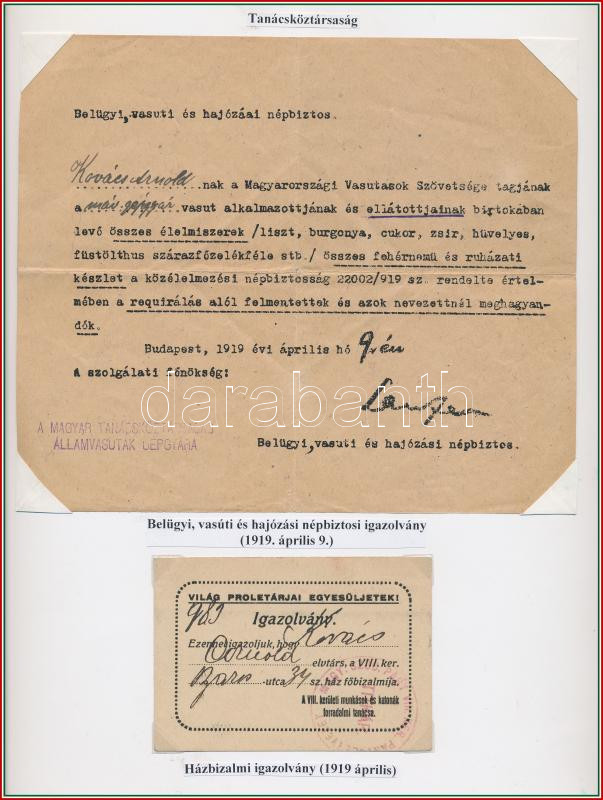 1919 Tanácsköztársasági okmányok: a Belügyi, vasúti és hajózási népbiz... https://www.darabanth.com/hu/270-Gyorsarveres/270.0/Festmeny-mutargy-papirregiseg-egyeb/Okmanyok~300115/1919-Tanacskoztarsasagi-okmanyok-a-Belugyi-vasuti-es-hajozasi-nepbiztos-altal-kialli~II1361070