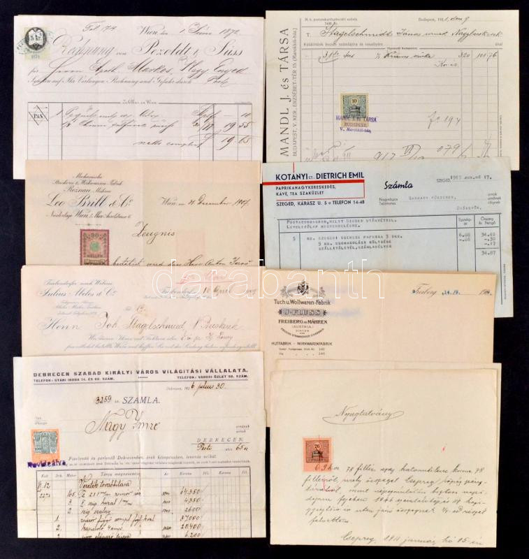 Leírás: cca 1872-1943 Vegyes okmány tétel: leginkább számlák, nyugtatványok, cca 14db, különböző méretben és minőségben, okmánybélyegekkel
