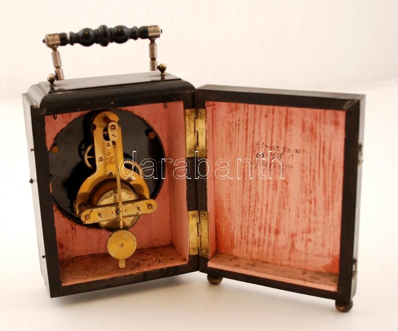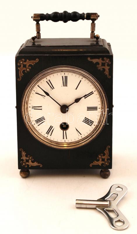 Leírás: cca 1850 bieder utazóóra, festett fa házban fém veretekkel, jelzett szerkezettel, működik, felhúzó kulccsal, m:18 cm