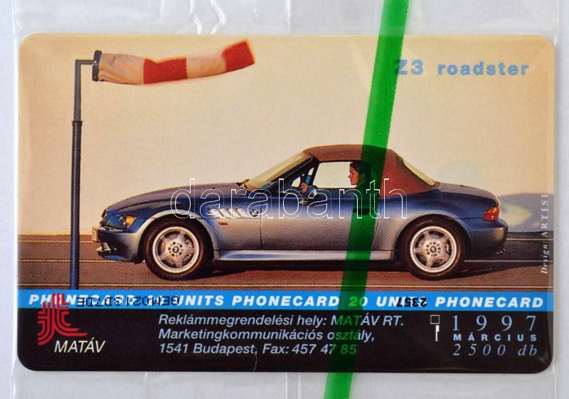 1997 BMW Z3 telefonkártya bontatlan csomagolásban https://www.darabanth.com/hu/270-Gyorsarveres/270.0/Festmeny-mutargy-papirregiseg-egyeb/Telefonkartyak~40/1997-BMW-Z3-telefonkartya-bontatlan-csomagolasban~II1365967