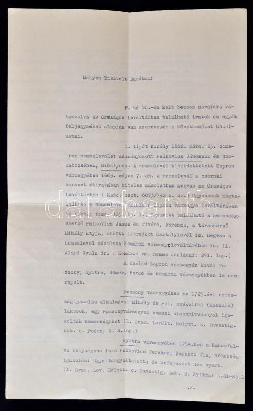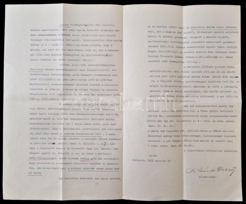 1931 Csánki Dezső (1857-1933) vallás- és közoktatásügyi címzetes államtitkár, az Országos Levéltár főigazgatójának géppel írt levele Palkovics László (1877-1933) Komárom-Esztergom k. e. e. vármegyék alispánjának családtörténeti ügyben, Csánki saját kezű aláírásával
