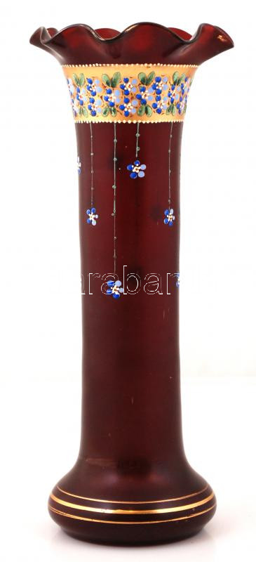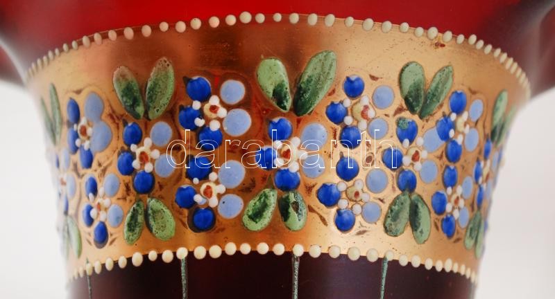 Leírás: Díszváza, kézzel festett zománc díszítéssel, fújt üveg, jelzés nélkül, nagyon apró csorbával / Glass vase with hand painted enamel ornaments. m:33 cm