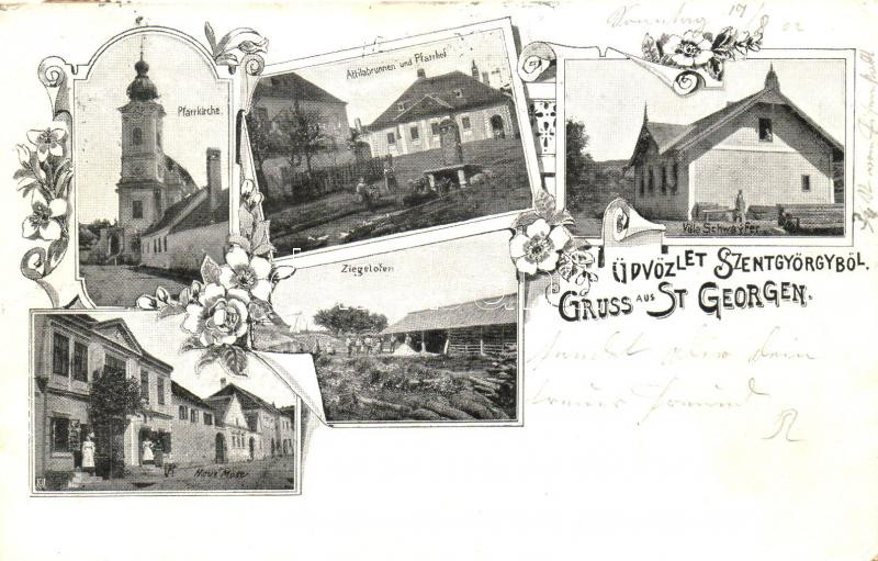 Lajtaszentgyörgy, Szentgyörgy, Sankt Georgen am Leithagebirge; Plébánia templom, Attila kút, plébánia, Villa Schwayfer, Mose-ház, Téglaégető / parish, church, fountain, villa, brick kiln, floral