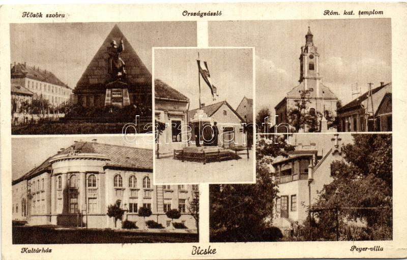 Leírás: Bicske, Hősök szobra, országzászló, kultúrház, Peyer villa, római katolikus templom (Rb)