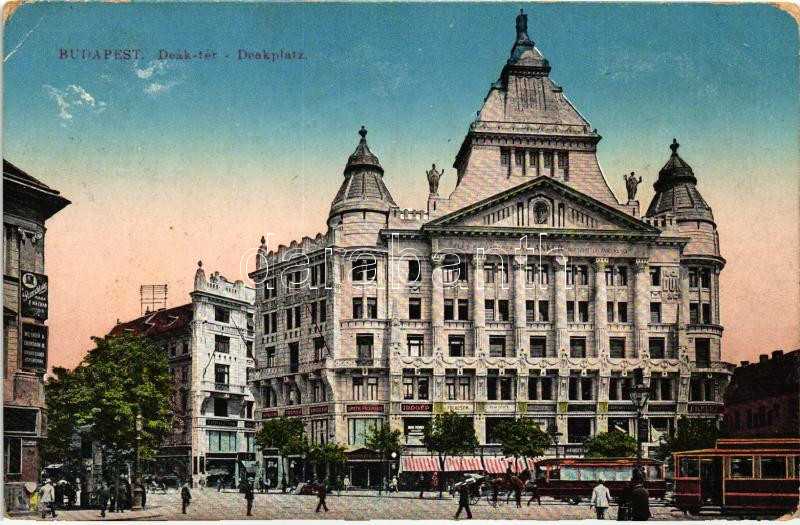 Leírás: Budapest V. Deák tér, Polacsek és Ekker üzlete, Premiere Smith írógép üzlet, villamosok (EK)