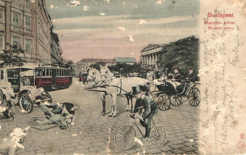 Leírás: Budapest VIII. Múzeum körút, villamosok, automobil, kerékpár, lovaskocsi (b)