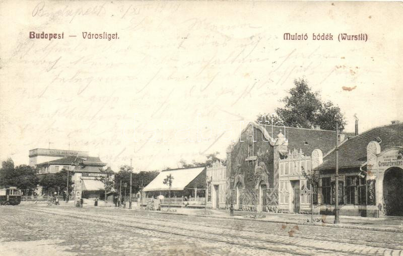 Leírás: Budapest XIV. Városliget, Mulató bódék, Wurstli, Magyar Műszínkör, villamos