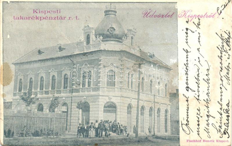 Leírás: Budapest XIX. Kispest, Takarékpénztár, kiadja Fischof Henrik (EB)