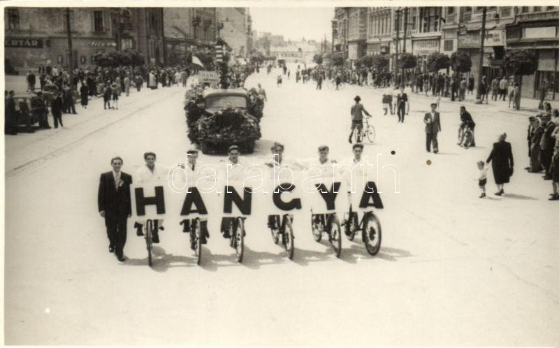 Leírás: Debrecen, Hangya szövetkezeti felvonulás, biciklisek, Burg József műszaki fotó és Fotó Horváth, photo