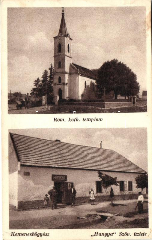 Leírás: Kemeneshőgyész, Római katolikus templom, Hangya szövetkezeti üzlet (EK)