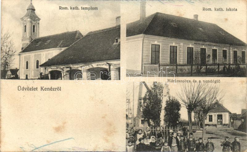 Leírás: Kenéz, Római katolikus templom és iskola, Mária szobor, vendéglő, kiadja a Hangya szövetkezet (EB)