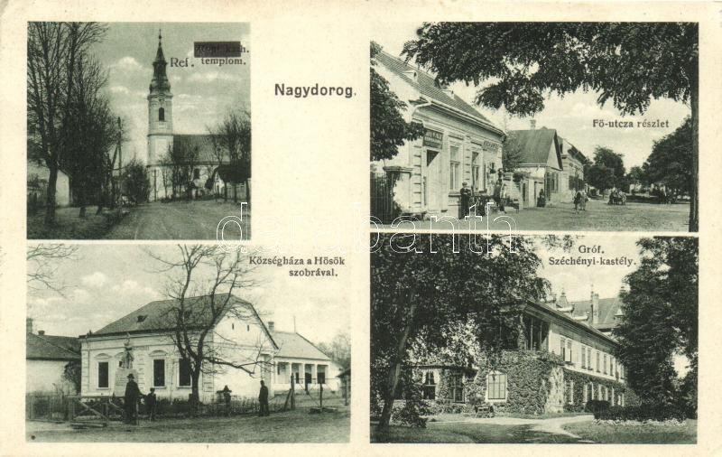 Leírás: Nagydorog, Koch Antal üzlete, Református templom, Széchenyi-kastély, hősök szobra, Koch Antal kiadása