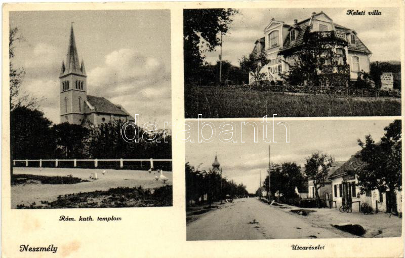 Neszmély, Katolikus templom, Keleti-villa, utcakép https://www.darabanth.com/hu/270-Gyorsarveres/270.0/Kepeslapok/Magyarorszag~300013/Neszmely-Katolikus-templom-Keleti-villa-utcakep~II1365761