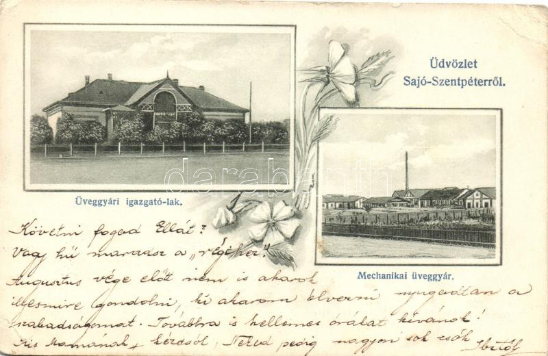 Sajószentpéter, Mechanikai üveggyár, igazgató-lak; floral, kiadja Gros... https://www.darabanth.com/hu/270-Gyorsarveres/270.0/Kepeslapok/Magyarorszag~300013/Sajoszentpeter-Mechanikai-uveggyar-igazgato-lak-floral-kiadja-Groszmann-Jozsef-EK~II1365602