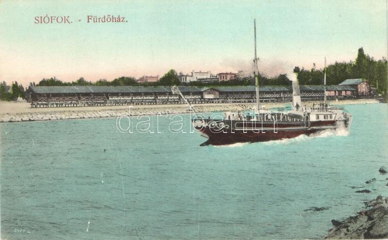 Leírás: Siófok, Fürdőház, Baross gőzhajó, kaidja Hirsch Mór