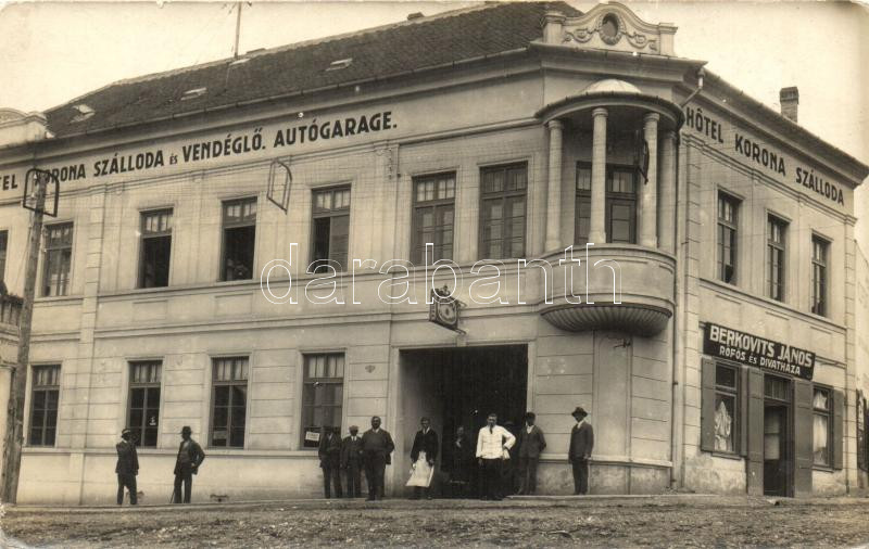 Vasvár, Korona szálloda, Berkovits János rőfös és divatháza, photo https://www.darabanth.com/hu/270-Gyorsarveres/270.0/Kepeslapok/Magyarorszag~300013/Vasvar-Korona-szalloda-Berkovits-Janos-rofos-es-divathaza-photo~II1364449