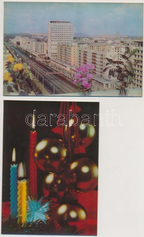 32 db használatlan MODERN dimenziós képeslap; karácsonyi üdvözlőlapok és észak koreai városképes lapok / 32 unused modern dimensional postcards; Christmas greetings and North Korean town-view postcards