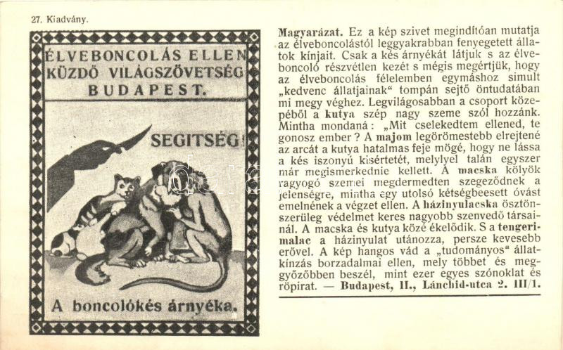 Állatkísérletek elleni progpaganda képeslap, Élveboncolás ellen küzdő világszövetség Budapest / Hungarian propaganda postcard against animal testing and vivisection (fa)