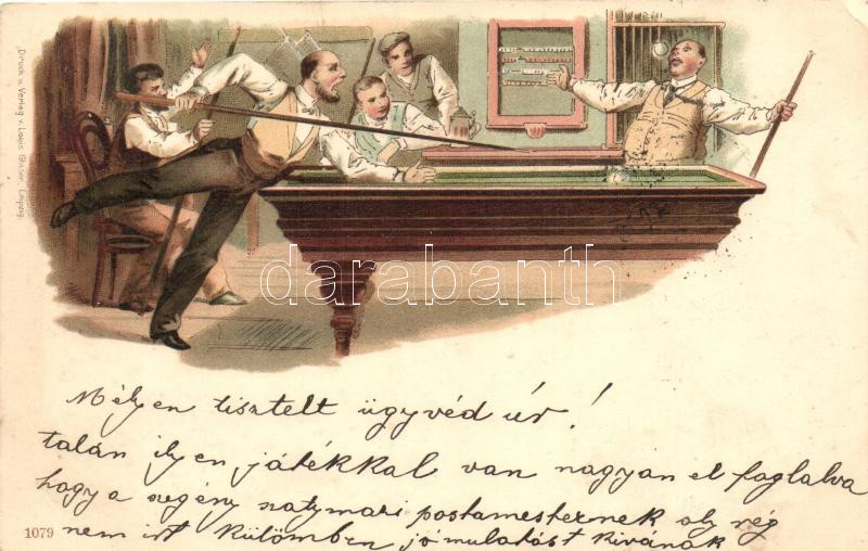 1899 Billiard game, humorous, Louis Glaser, litho (EK) https://www.darabanth.com/hu/270-Gyorsarveres/270.0/Kepeslapok/Sport~300099/1899-Billiard-game-humorous-Louis-Glaser-litho-EK~II1363955