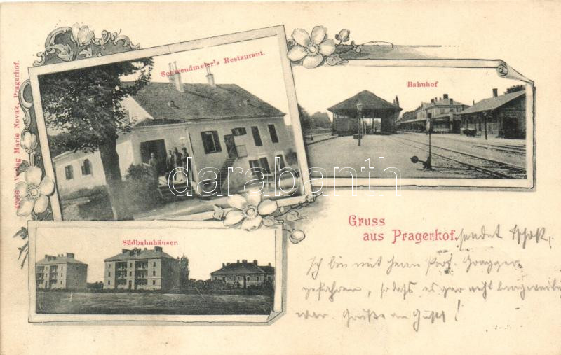 Leírás: Pragersko, Pragerhof; Bahnhof, Südbahnhauser, Schwendmeier's Restaurant / railway station, restaurant floral (cut)