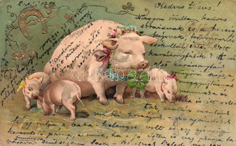 New Year, pigs, clover, horseshoe, Emb. litho (EK) https://www.darabanth.com/hu/270-Gyorsarveres/270.0/Kepeslapok/Udvozlolapok-Unnepek~300105/New-Year-pigs-clover-horseshoe-Emb-litho-EK~II1364585