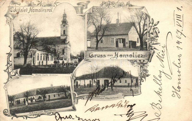Omlód, Homolicz, Omoljica; Római katolikus templom, Posta és telefon hivatal, Schweitzer vendéglő, Gyergyovits üzlete / church, post and telephon office, guest house, shop, floral, Art Nouveau (EB)