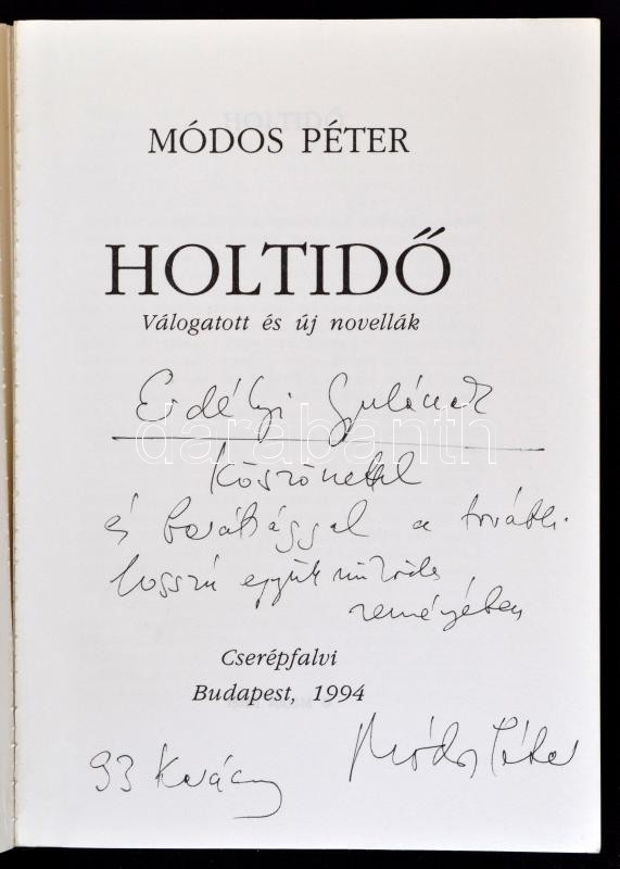 Módos Péter: Holtidő. Budapest, 1994, Cserépfalvi. A szerző által dedi... https://www.darabanth.com/hu/270-Gyorsarveres/270.0/Konyvek/Konyvek-Egyeb-ritkasagok~43/Modos-Peter-Holtido-Budapest-1994-Cserepfalvi-A-szerzo-altal-dedikalt-peldany-Ragaszt~II1360650