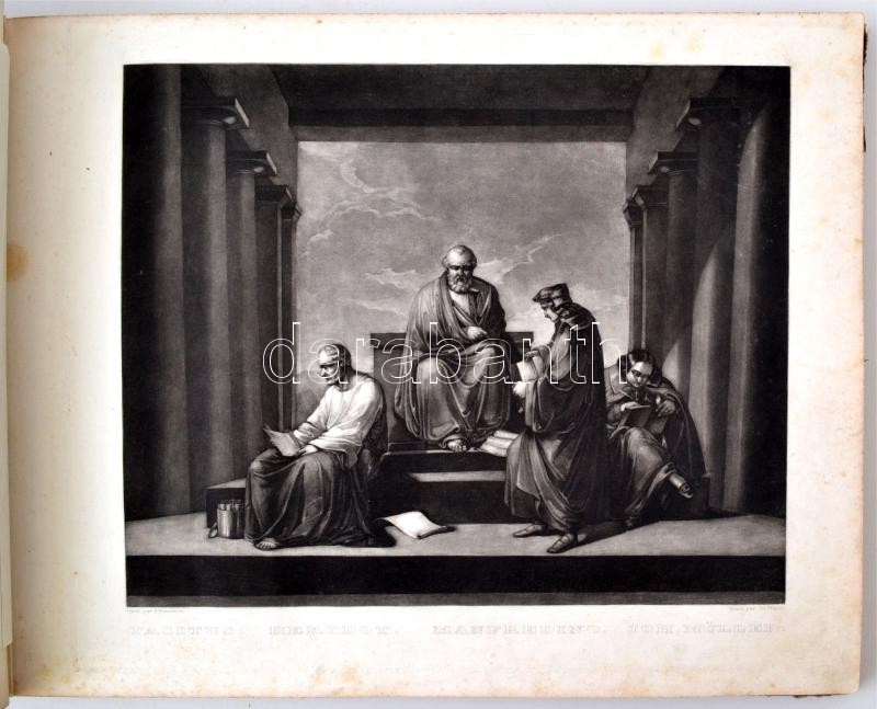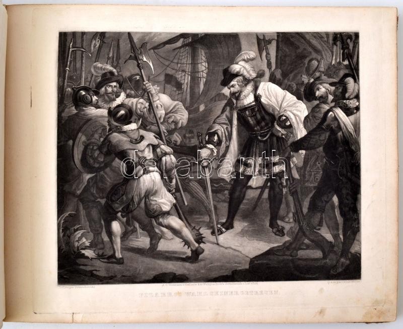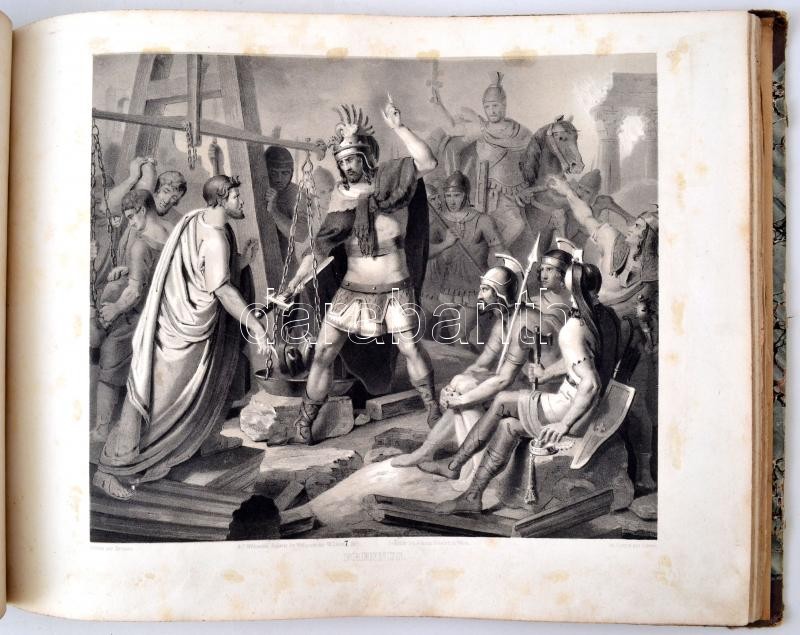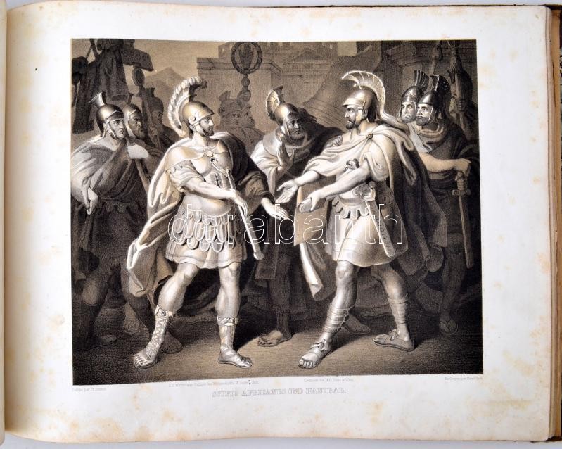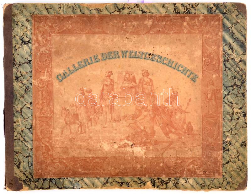 53 piecies of full pages lithographies from A.C. Wittmann's Gallerie de Weltgeschichte. In german language. From the middle of the 19th century. Paperbinding. The cover enveloped and it is damaged. The binding is damaged, and corrected. The front page lost. Some pages are raunchy, and crinkled.
