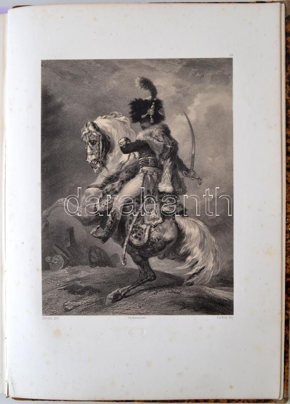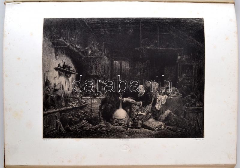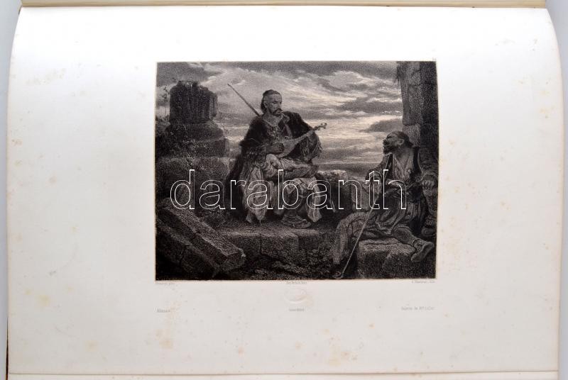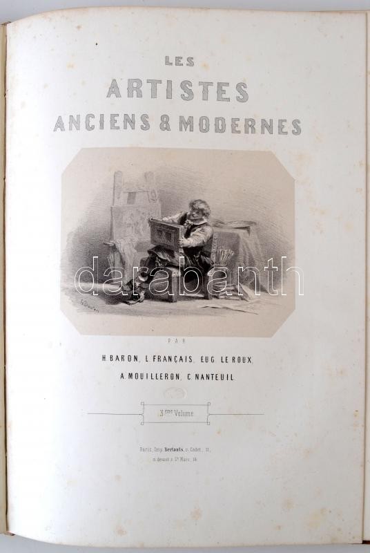 Henri Charles Antoine Baron (1816-1885) - Louis Francais (1814-1897) - Eugéne Le Roux (1807-1863) - Adolphe Mouilleron (1820-1881) - Célestin Nanteuil (1813-1873): Les Artistes anciens et modernes két kötete, egy ismeretlen és a 3. kötete, egybekötve. Paris, É.N , Bertauts. Félbőr kötés, 36 t.+1 p+41 t. 41x30 cm. 77 darab egész oldalas litográfia a XIX. század közepéről. Francia nyelvű 10 kötetes művészeti folyóirat egy ismeretlen és 3 kötete. A borítója kopott, a könyvből két tábla kijár. Az első résznek nincs címlapja és hiányos. / 77 piecies of full pages lithographies from the middle of the 19th century. It is two volumes from the ten volumes art periodical in french languages. The first part is unkown volume and the second part is the third volume. Half leather binding. The cover is little bit worn. Two pages way out from the book. The first part cover and some pages are wanting.