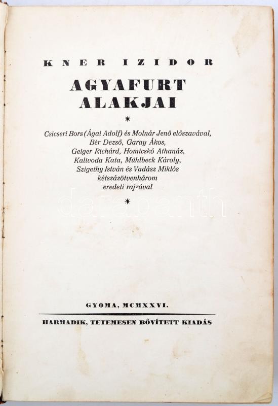Kner Izidor: Kner Izidor Agyafurt alakjai. Csicseri Bors (Ágai Adolf), Molnár Jenő előszavával. Bér Dezső, Garay Ákos, Geiger Richárd, Homicskó Athanáz, Kalivoda Kata, Mühlbeck Károly, Szigethy István, Vadász Miklós 253 eredeti rajzával. Harmadik, tetemesen bővített kiadás. Gyoma, 1926, Kner Izidor. Kiadói félvászon kötés, 367 p. A könyv borítója kopottas. A könyv borítója kopott, foltos. Kötés meglazult, sérült. A lapok néhol foltosak.