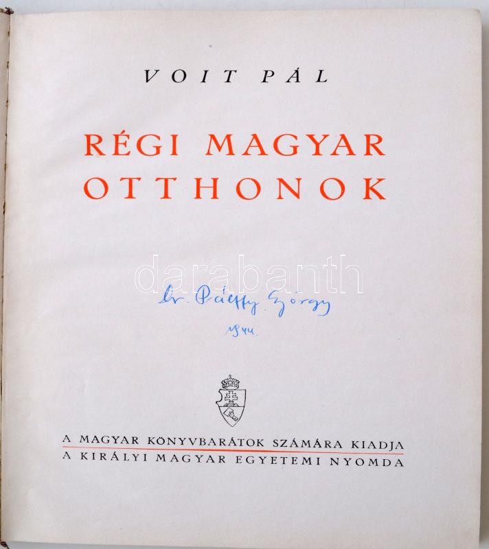 Voit Pál: Régi magyar otthonok. Budapest, 1943, Királyi Magyar Egyetemi Nyomda. Kiadói, kopottas és picit foltos, félvászonkötésben, 319 p. Az elülső előzéklapon ex-libris-szel. A címlapon tulajdonosi névbejegyzéssel. Egyébként jó állapotban. Számos képpel illusztrálva.