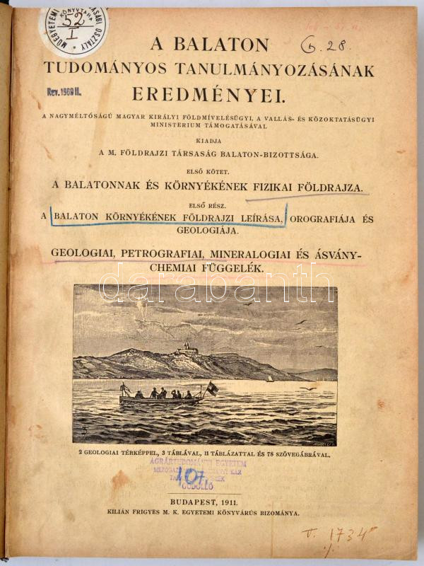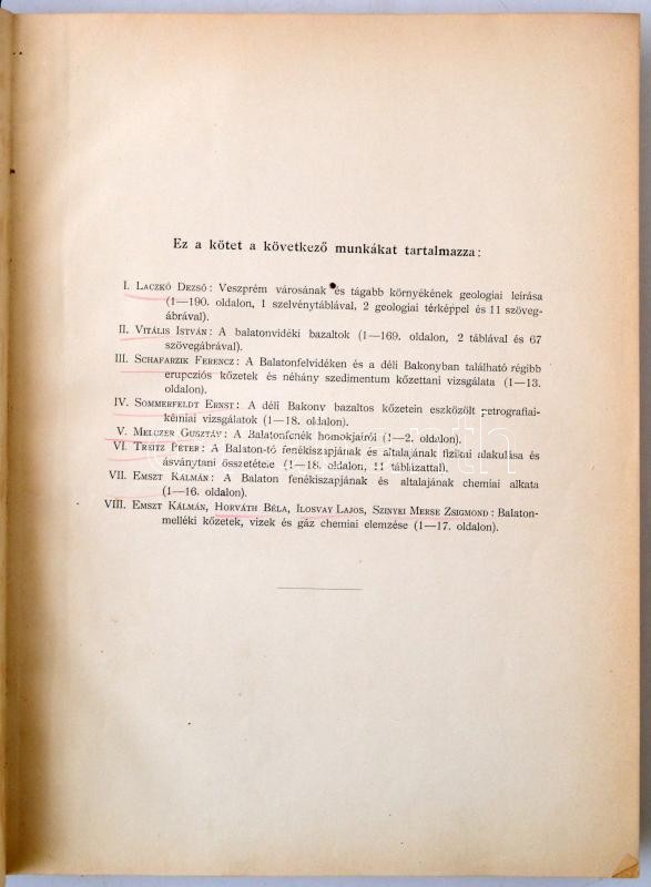 Balaton Tudományos Tanulmányozásának Eredményei I. A Balatonnak és környékének fizikai földrajza. 1. A Balaton környékének földrajzi leírása, orográfiája és geologiája. Geologiai, petrografiai, mineralogiai és ásványchemiai függelék. Több térképpel, táblázattal és ábrával. Több szerző: Laczkó Dezső, Vitális István, Schafarzik Ferencz, Sommerfeldt Ernst, Melczer Gusztáv, Treitz Péter, Emszt Kálmán, Horváth Béla, Ilosvay Lajos, Szinyei Merse Zsigmond. Budapest, 1911, Kilián Frigyes M. K. Egyetemi Könyvárus Bizománya. Kopottas félvászon kötés. A címlapon, és a tartalomjegyzéknél ceruzás aláhúzásokkal. Volt könyvtári példány!