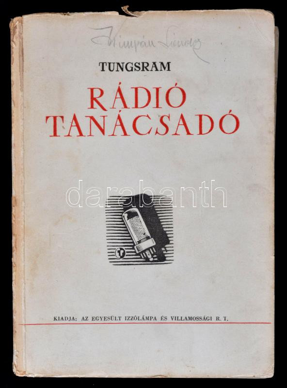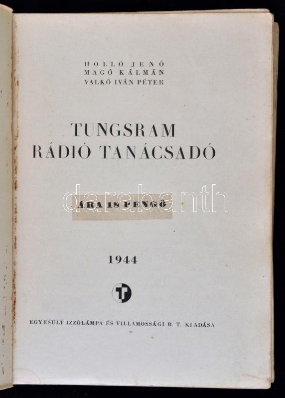 Holló Jenő-Magó Kálmán-Valkó Iván Péter: Tungsram Rádió Tanácsadó. Budapest, 1944, Egyesült Izzólámpa és Villamossági R.T. Kiadói papírkötés, 285 p. A könyv megviselt állapotban. A borítója szakadozott, maszatos. A könyvből egy ív kijár (235-266 p.). A kötése sérült.