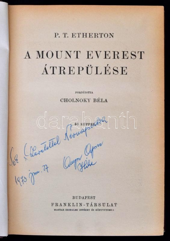 Etherton, P. T.: A Mount Everest átrepülése. Bp., é. n., Franklin Társulat. Kissé elváló díszes, aranyozott, kicsit kopott vászonkötésben, egyébként jó állapotban.